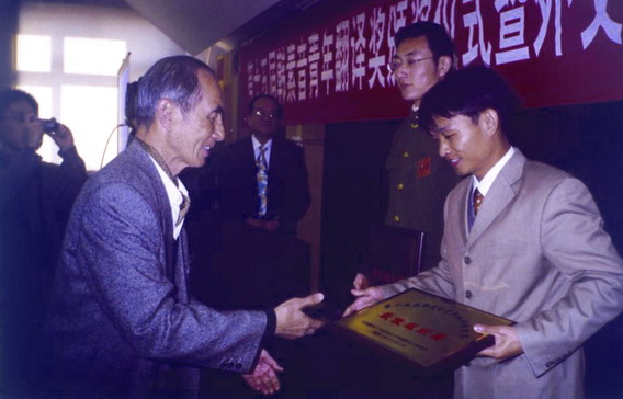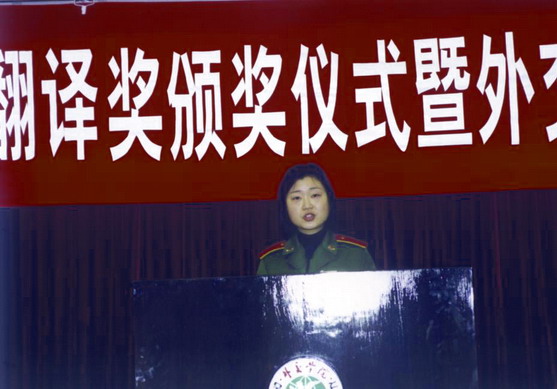 时任中国译协常务副会长、《中国翻译》杂志主编林戊荪先生为获本次竞赛最佳组织奖的单位南京解放军国际关系学院和中南大学外国语学院颁奖