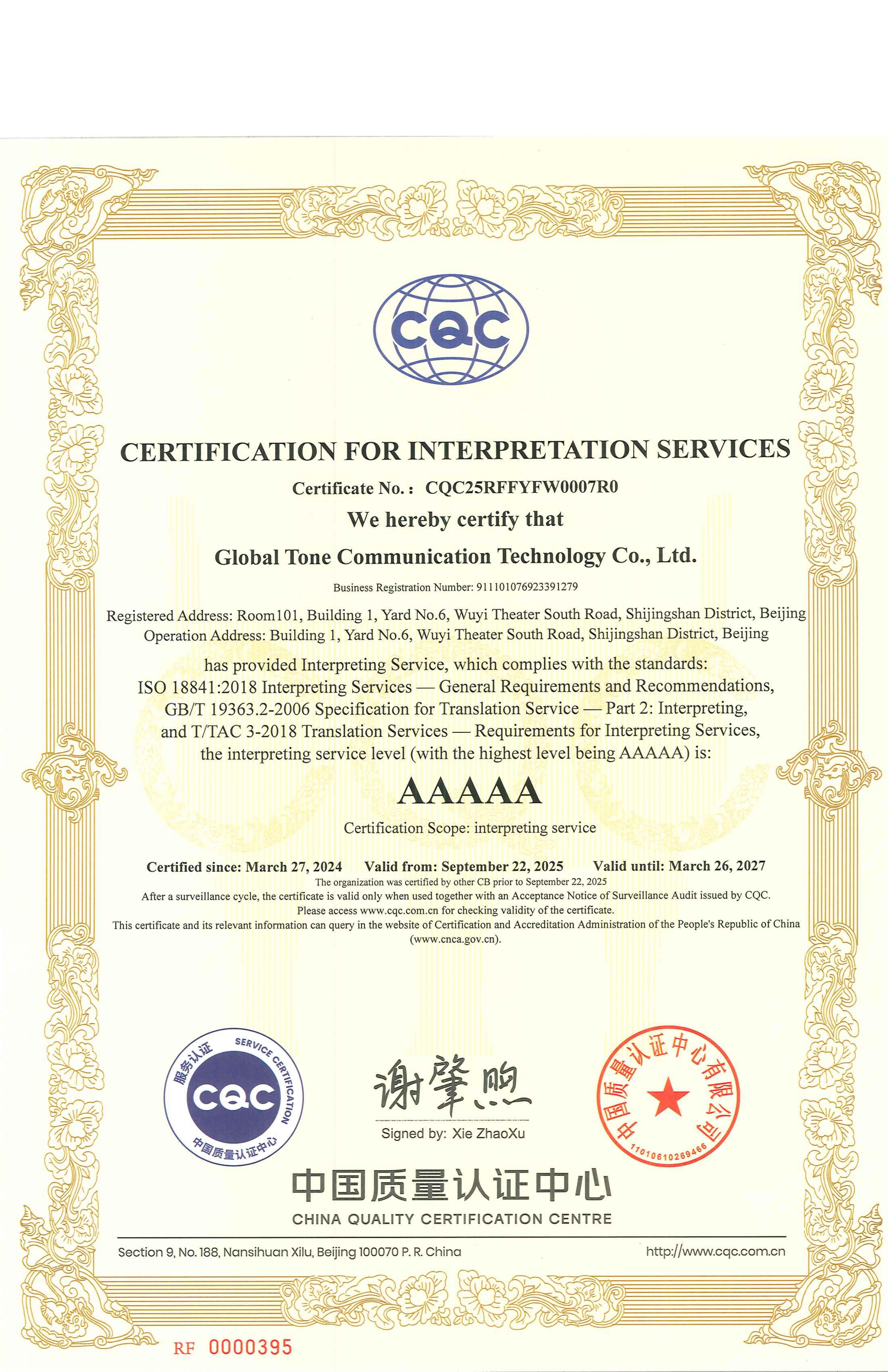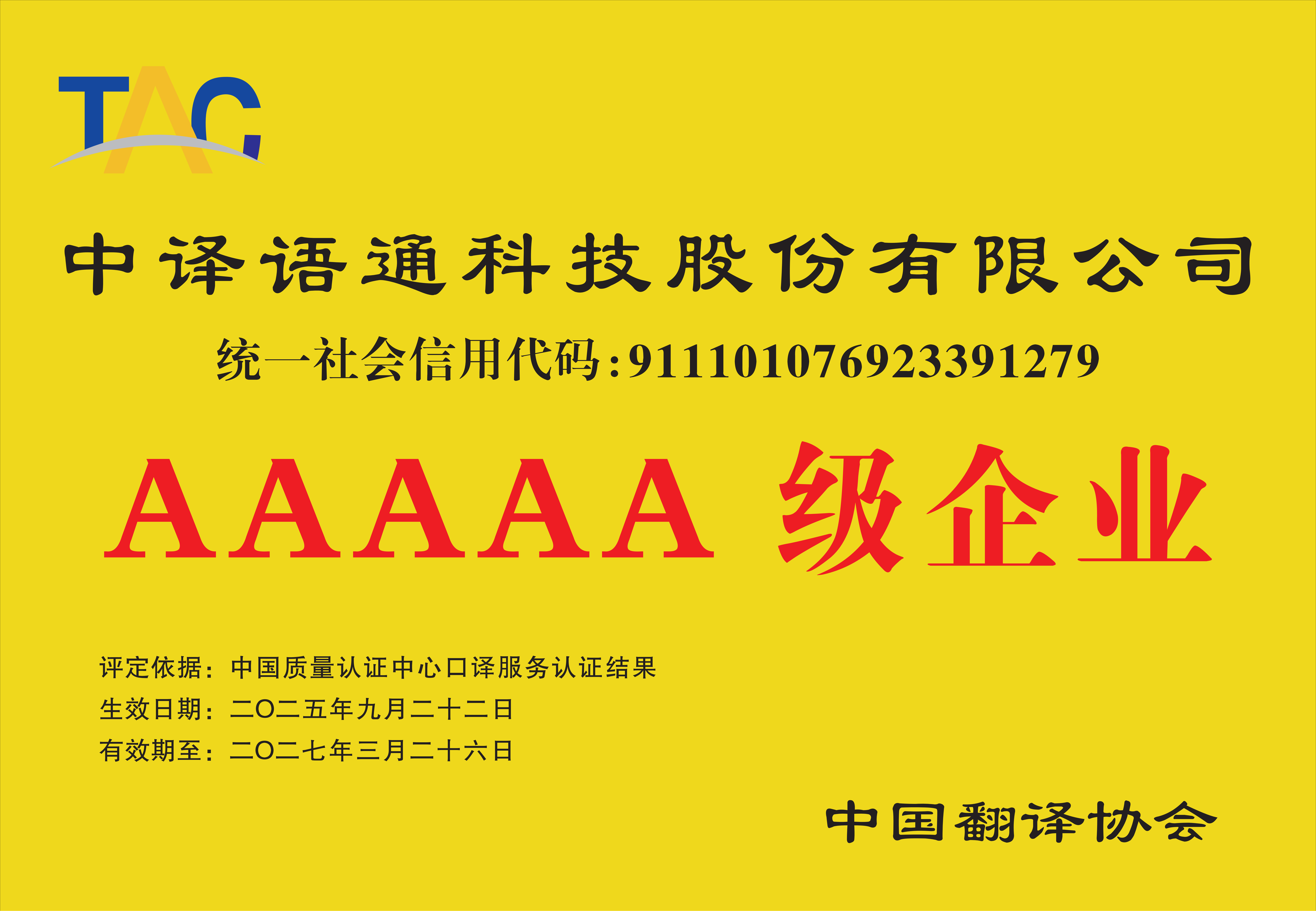 从2018年至今,中译语通科技股份有限公司连续三年接受了中国翻译协会与方圆标志认证集团有限公司共同组织的笔译服务认证。2018年10月,获得4A级企业认证,2019年在持续改进的基础上,于2020年获得5A级企业认证。持续三年认证,中译语通在强化服务设计理念,建立以顾客为中心的质量指标体系和评价体系,持续改进和提升翻译服务质量方面,收到明显成效。