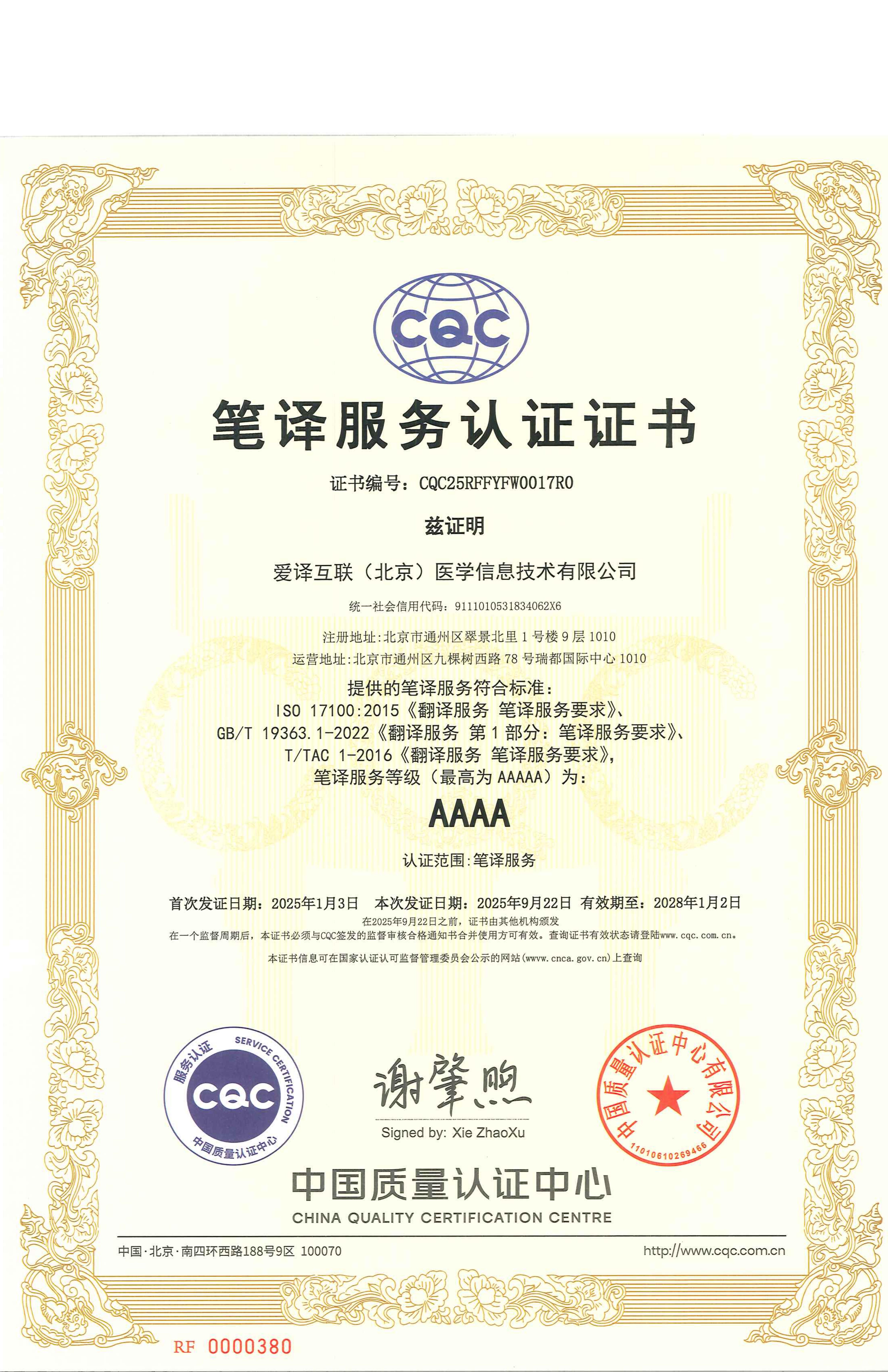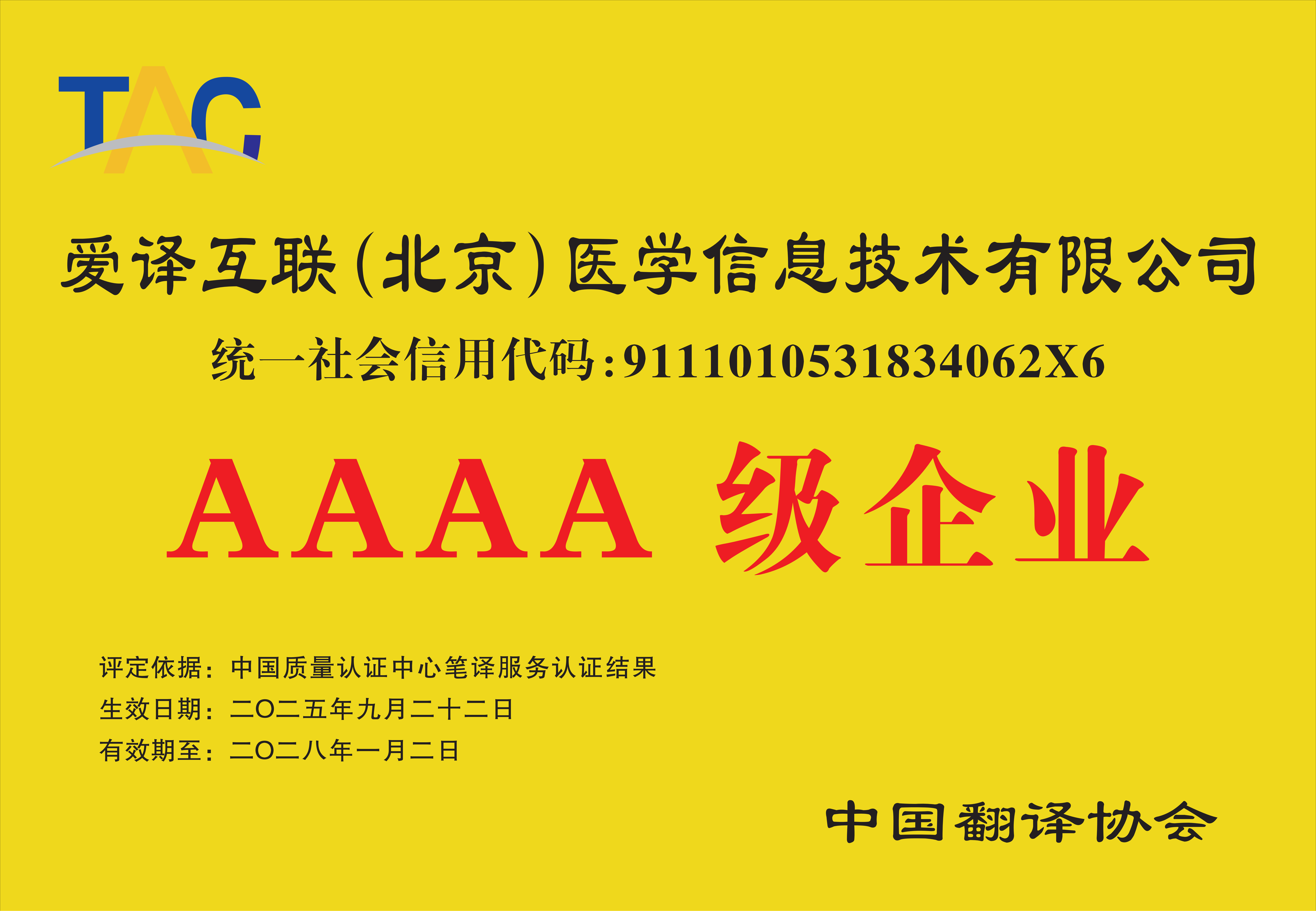 爱译互联(北京)医学信息技术有限公司(简称爱译集团)专注于医学领域翻译。我们长期在医药,医疗,医疗器械,生物科技等领域为海内外企业提供中译外,外译外的口笔译工作。我们先后成功地为广大国内外医疗医药企业、医学咨询网、医科大学及国家医学科研机构提供过优秀的BPO翻译解决方案。我们积极参与笔译服务认证工作,并于2025年1月成功获得方圆标志认证集团有限公司认证的笔译服务4A级证书。