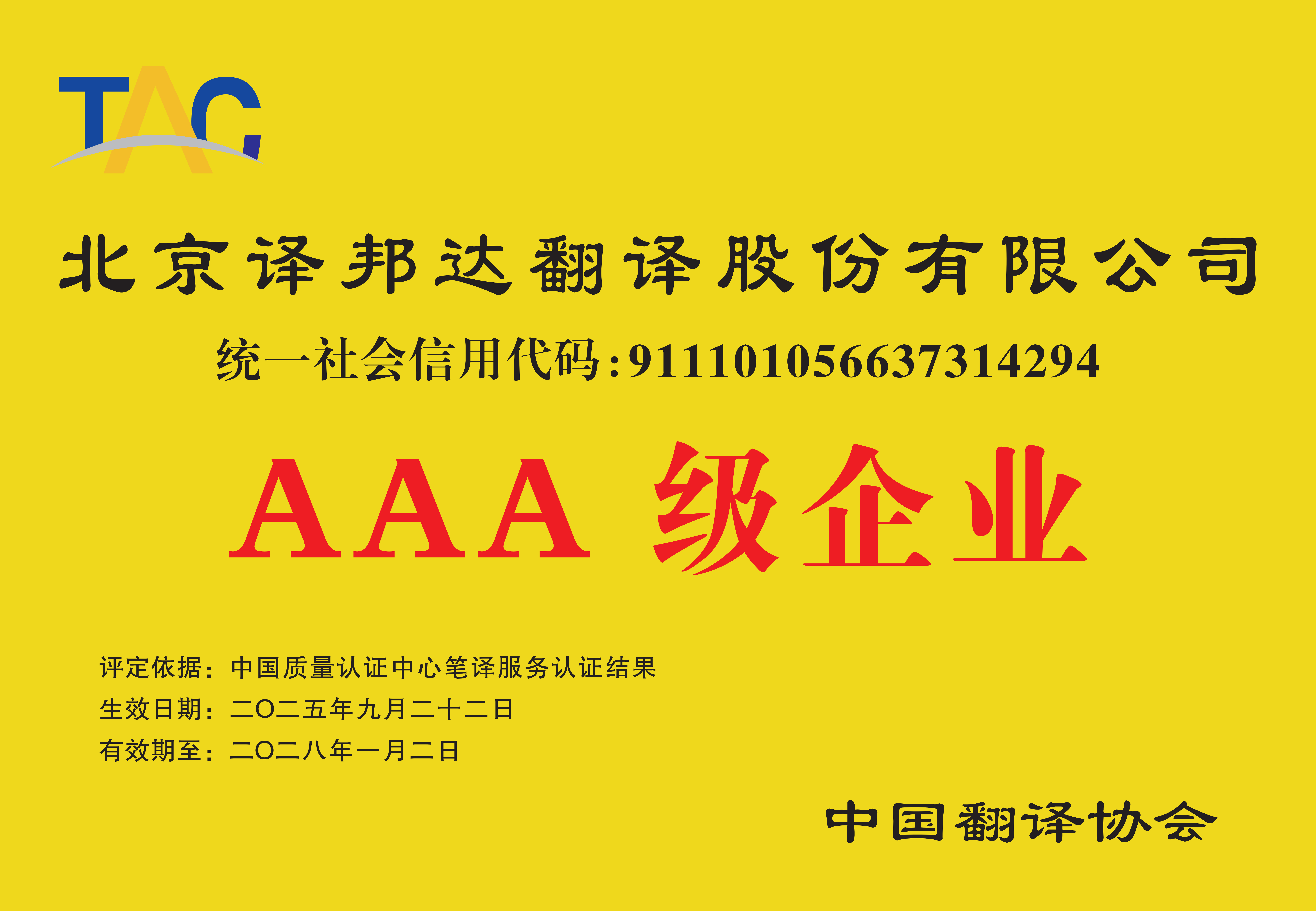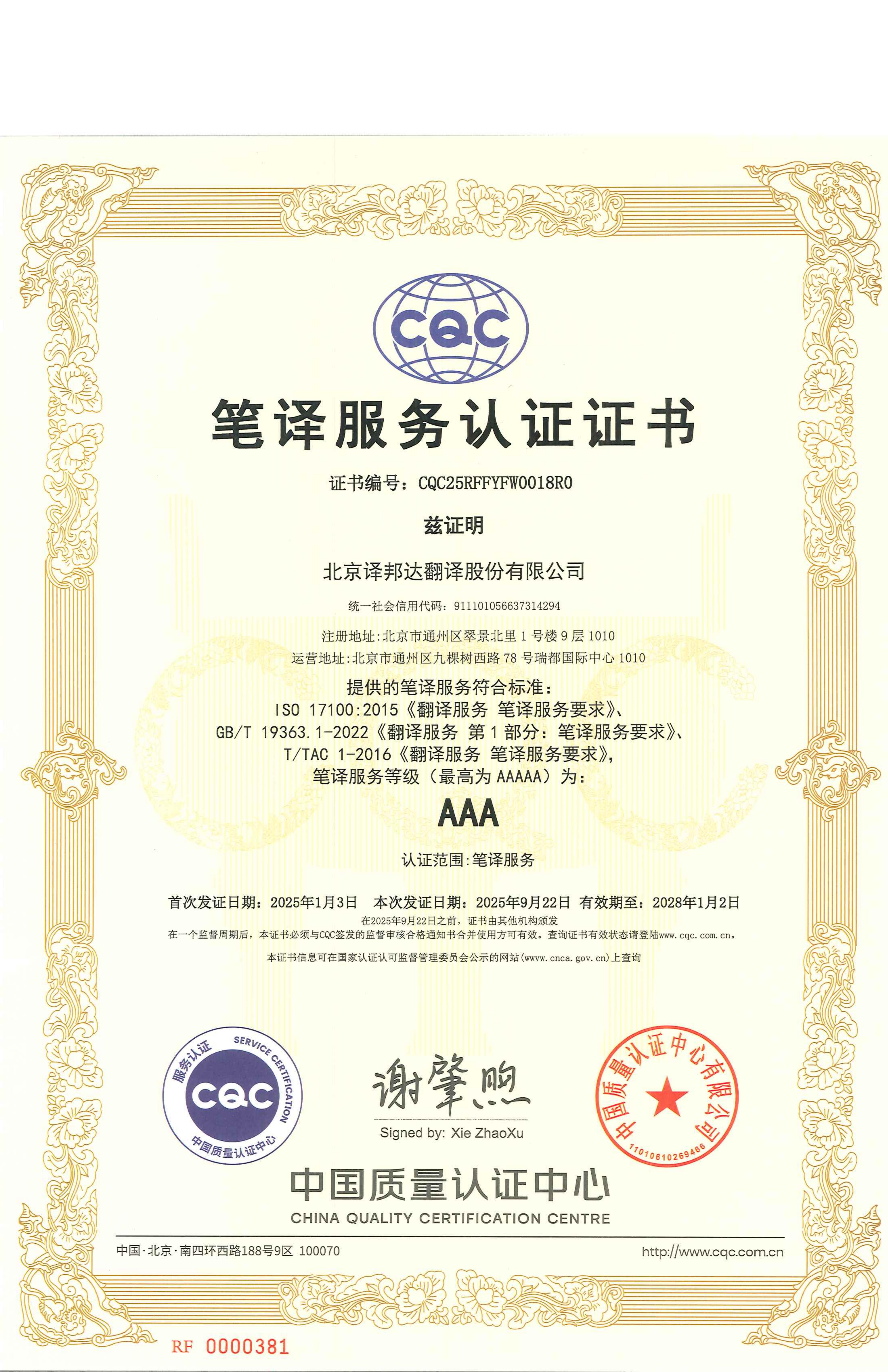 北京译邦达翻译股份有限公司(简称“译邦达”)成立于2007年,经过不断地规模扩展与技术迭代,目前已经成长为一家全能高效成熟的现代大型翻译企业。我们于2015年顺利获得了国标ISO9001质量体系认证,2021年成功取得了ISO17100国际翻译服务认证,并且于2025年1月成功获得方圆标志认证集团有限公司认证的笔译服务3A级证书,从而使我们能够为广大客户提供更专业的中外互译、外外互译、商务谈判口译、交替传译及同声传译等多种符合国际标准的翻译解决方案。