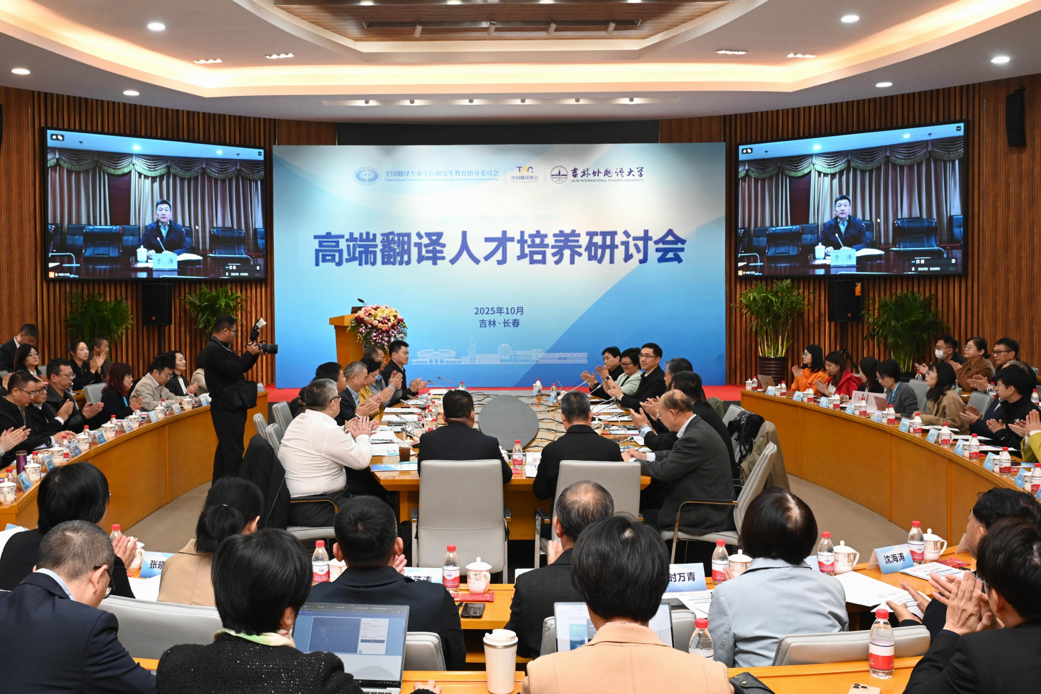 10月13日,2025年高端翻译人才培养研讨会在吉林外国语大学召开。中国外文局、教育部学位管理与研究生教育司、吉林省教育厅领导,全国翻译专业学位研究生教育指导委员会(以下简称“全国翻译教指委”)专家、特邀专家以及翻译博士专业学位(DTI)授权点及申请自设DTI的多所院校代表出席会议。