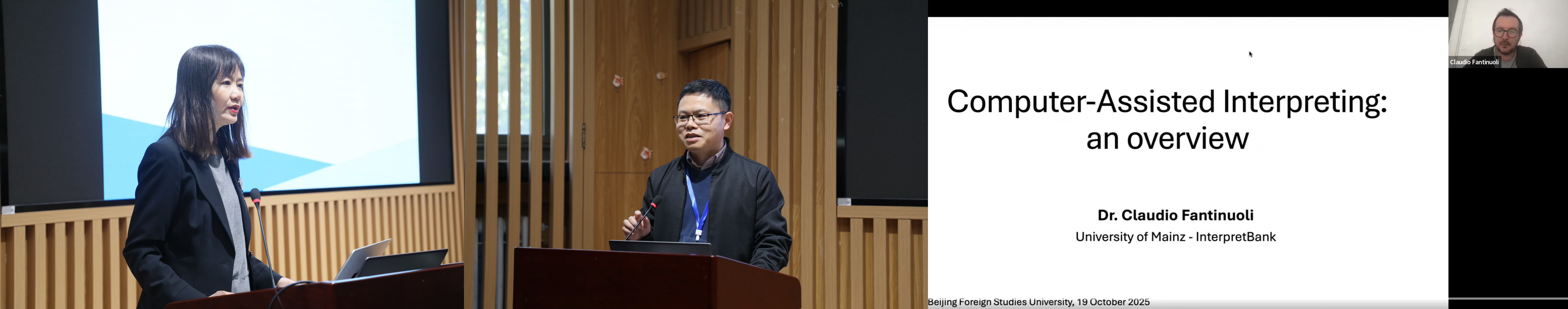 主旨报告环节,北外高级翻译学院院长任文教授通过中外核心期刊中口译技术相关文献的分析,考察中外学界对口译技术的接受情况,发现学界对口译技术抱有审慎与乐观并存的情感倾向,对技术的接受具有多维审视与辩证反思的特征。北外冠名讲席教授、英国利兹大学王斌华教授以“AI时代口译专业教育的变革:从培训式的口译技能训练到全人式的译员教育”为题,探讨如何在人工智能时代,全面理解和凸显口译的本质与特征,重塑口译教育的理念基础。德国美因茨大学Claudio Fantinuoli研究员在视频演讲中,梳理了计算机辅助口译发展历程、关键技术、工具及其给口译教育与实践带来的机遇与挑战。北外英语学院张威教授阐述了人工智能时代口译研究的价值定位,强调口译研究应避免“象牙塔”式的自我价值循环,要突出其实践应用价值。科大讯飞AI研究院孔常青总监聚焦“大模型时代的语音同声传译”,介绍了语音到语音同声传译技术的具体进展与重要突破。该环节分别由北外高级翻译学院副院长姚斌教授、口译教育与实践研究中心主任卢信朝副教授主持。