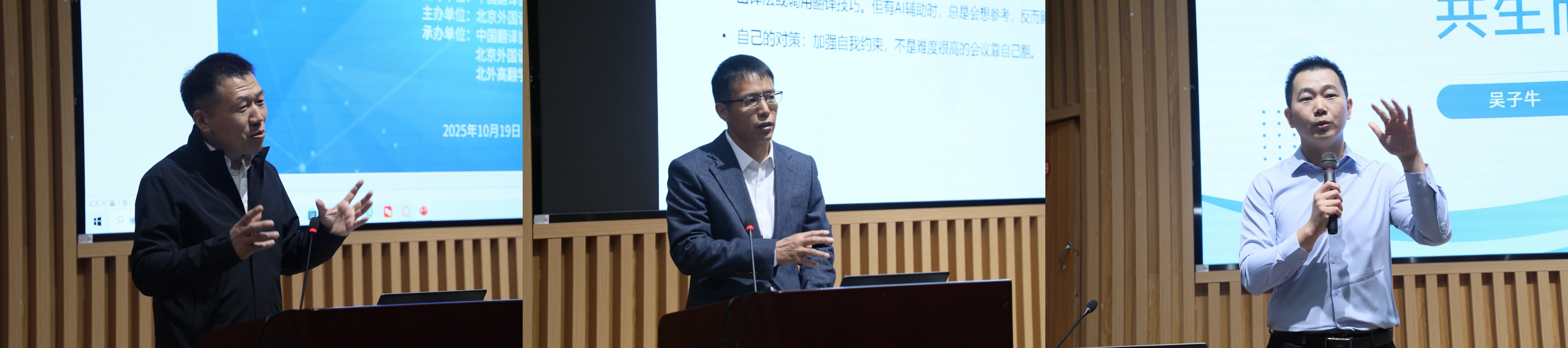 在“AI与口译实践”专题分享环节,北外高级翻译学院2010届校友、北京市委外办市政府外办环太处副处长张奇,北外高级翻译学院2011届校友、中国气象局外事服务中心原六级职员、现中英俄三语自由译员陈原林,北外高级翻译学院2014届校友、德意志银行(中国)有限公司公共事务主管吴子牛,从政府部门译员、企事业单位译员及自由译员视角,结合自身丰富的口译实践经验,分享了AI时代口译职业实践的新机遇与新挑战,并强调了人工译员的主导作用和AI的工具属性。北外高级翻译学院副院长李长栓教授主持该环节。