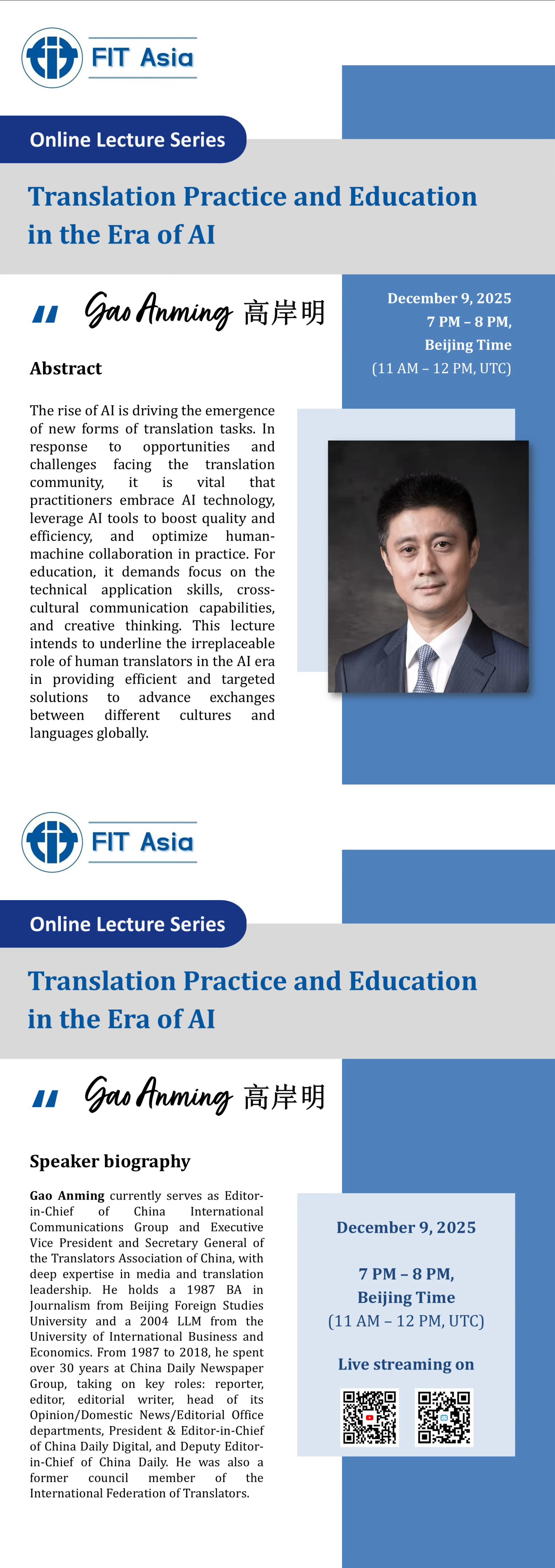 首场讲座定于2025年12月9日(周二)19:00-20:00(北京时间,UTC 11:00-12:00)全球开播,特邀中国外文局总编辑、中国翻译协会常务副会长兼秘书长高岸明先生担任主讲嘉宾。高岸明先生深耕媒体与翻译领域三十余载,兼具国际传播及翻译行业实践与管理经验。他将围绕“AI时代的翻译实践与教育”主题,通过解析AI技术对翻译实践的重塑逻辑,阐释人机协作的效能边界和翻译教育的核心能力,揭示人类译者在跨文化精准沟通中不可替代的价值。