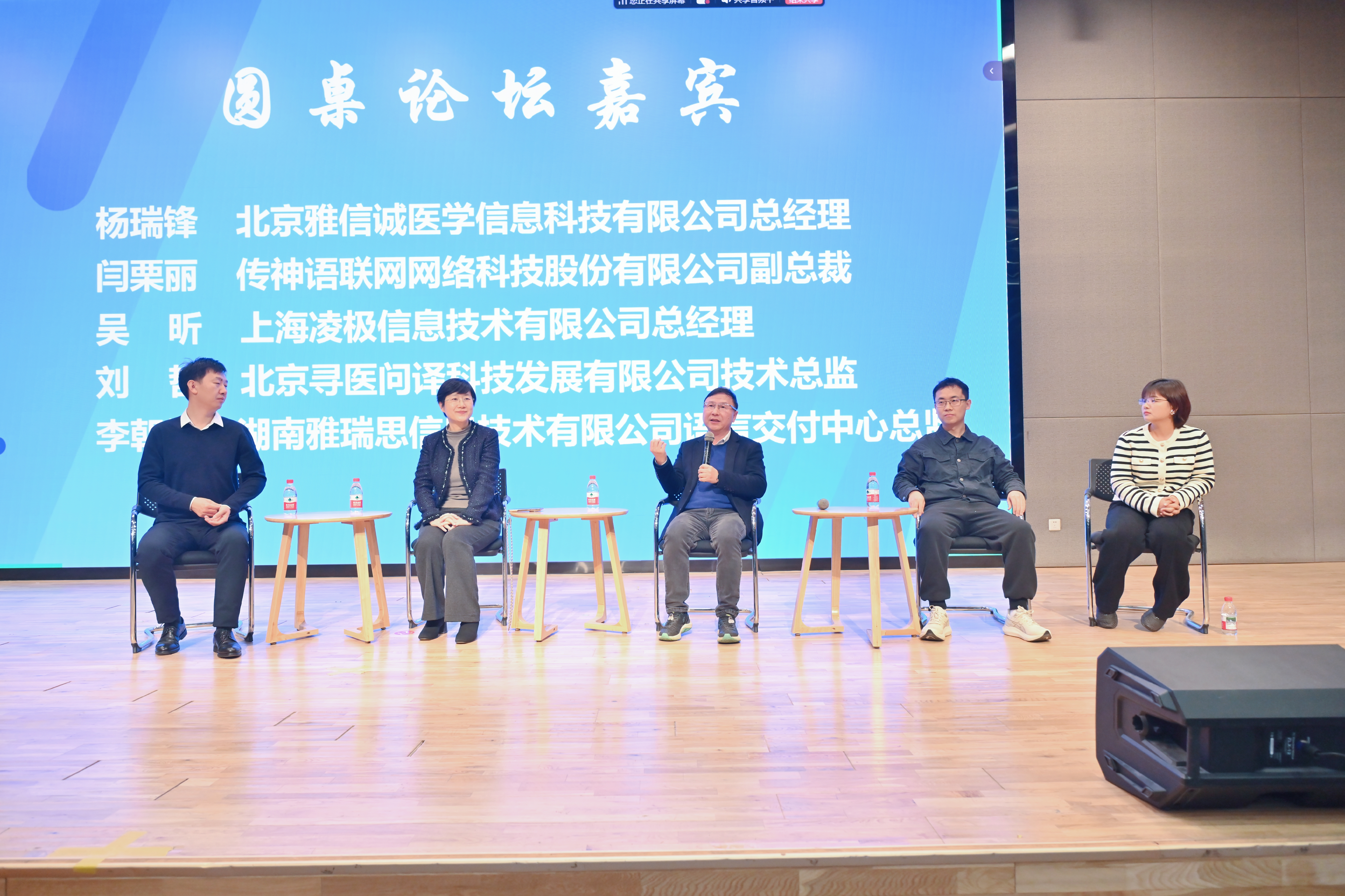 圆桌论坛由中国翻译协会医学语言服务专业委员会副秘书长、广东外语外贸大学陈庆副教授主持。北京雅信诚医学信息科技有限公司总经理杨瑞锋、传神语联网网络科技股份有限公司副总裁闫栗丽、上海凌极信息技术有限公司总经理吴昕、北京寻医问译科技发展有限公司技术总监刘哲、湖南雅瑞思信息技术有限公司语言交付中心总监李朝辉等企业代表以“智语医言:语言服务与国际传播”为主题,围绕技术应用、校企协同、人才需求等话题展开了深度对话,为促进学界与产业界的双向赋能、协同创新提供了具有前瞻性与可操作性的路径参考。