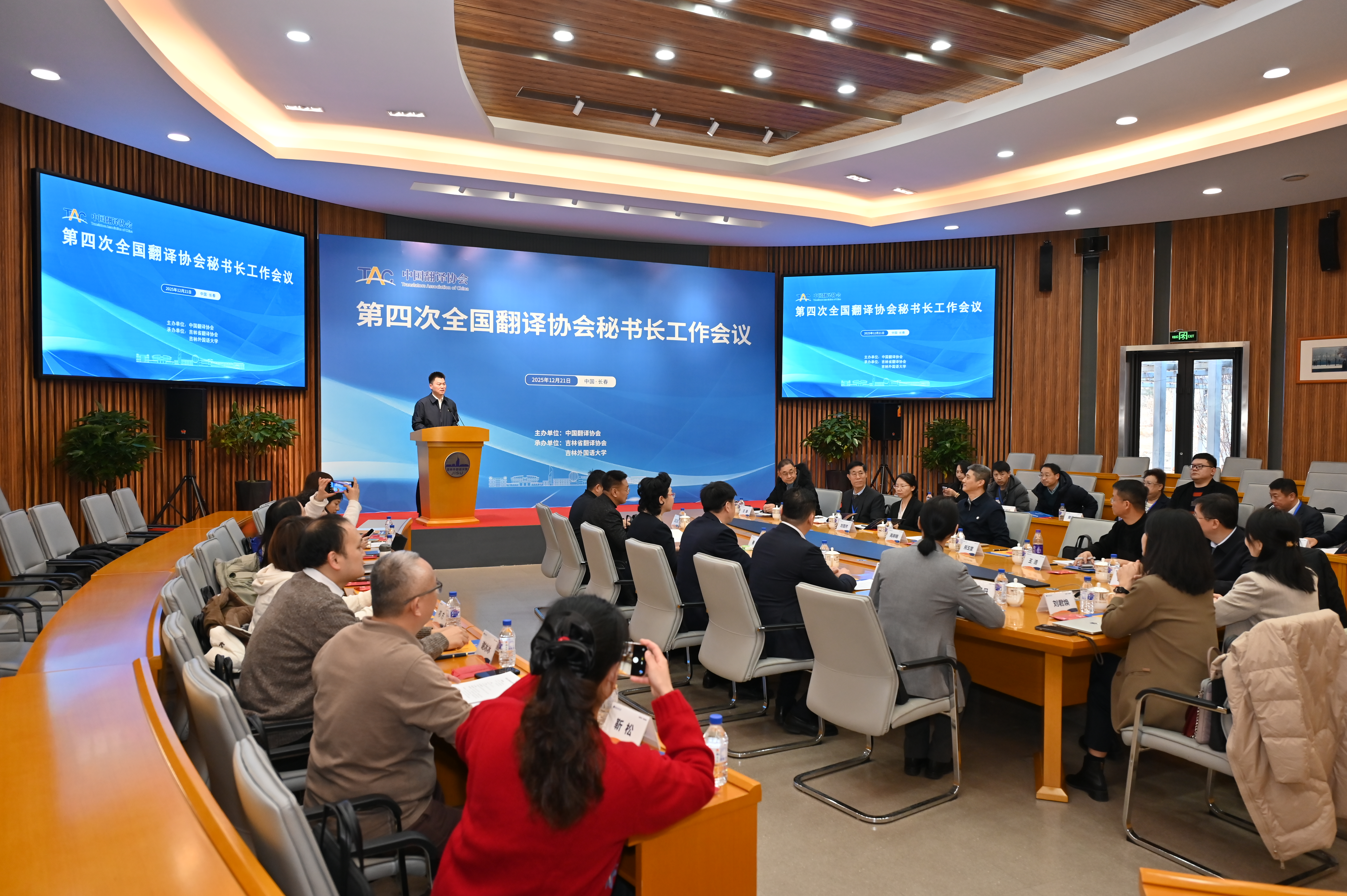 12月21日,由中国翻译协会主办、吉林省翻译协会与吉林外国语大学承办的第四次全国翻译协会秘书长工作会议在吉林长春举办。中国外文局总编辑、中国翻译协会常务副会长兼秘书长高岸明,吉林外国语大学校长、中国翻译协会常务副会长、吉林省翻译协会会长秦和,吉林省外事办公室副主任赵树新出席会议并致辞。来自全国各省区市的24家翻译协会近50名代表参加会议。