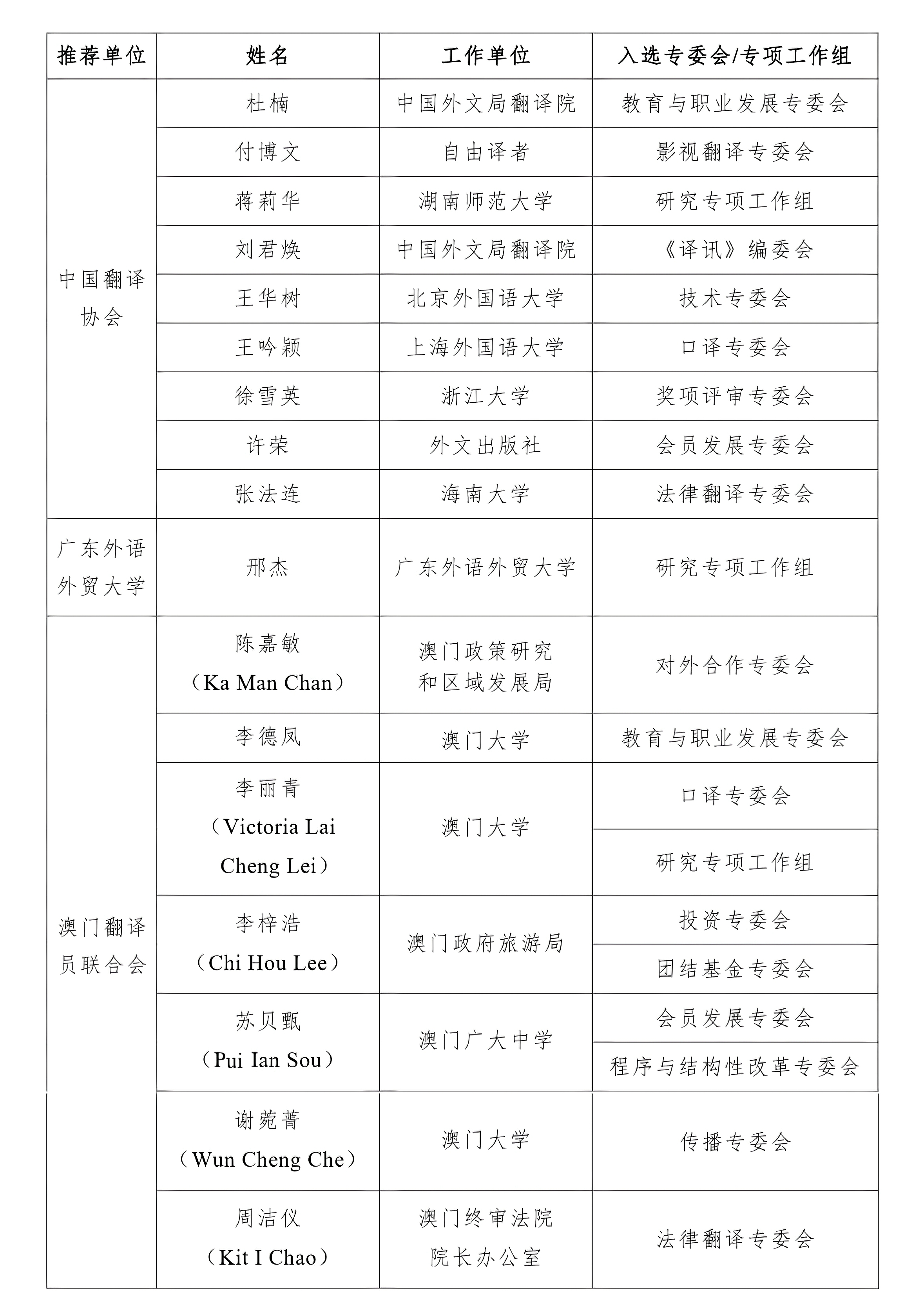 近日,国际翻译家联盟(简称“国际译联”)公布了2025-2028专门委员会及专项工作组成员名单。由中国翻译协会、广东外语外贸大学推荐的10位专家入选,由澳门翻译员联合会推荐的7位专家也同时入选,共涉及影视翻译、口译、法律翻译、教育、研究、传播、技术等14个工作领域。专家名单及相关专委会、专项工作组简介附后。中国翻译协会、广东外语外贸大学和澳门翻译员联合会同为国际译联会员。