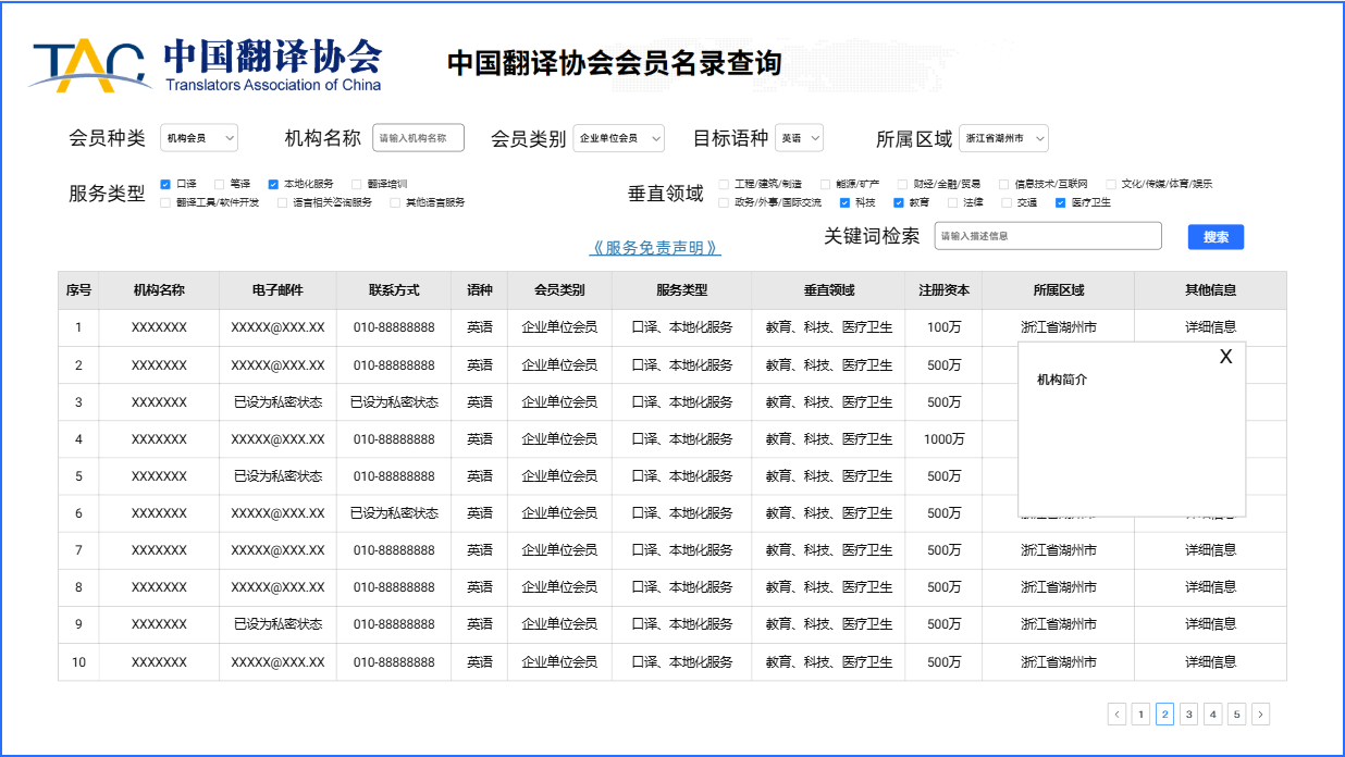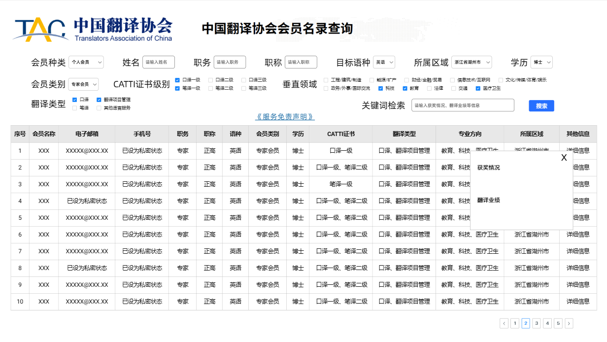 会员名录面向全网开放,检索界面将显示会员姓名(单位名称)、联系方式(电子邮箱、电话)、语种、服务类型等信息。请及时完成会员名录信息填报,确认是否同意公布个人/单位信息,并选择可公开的信息选项。