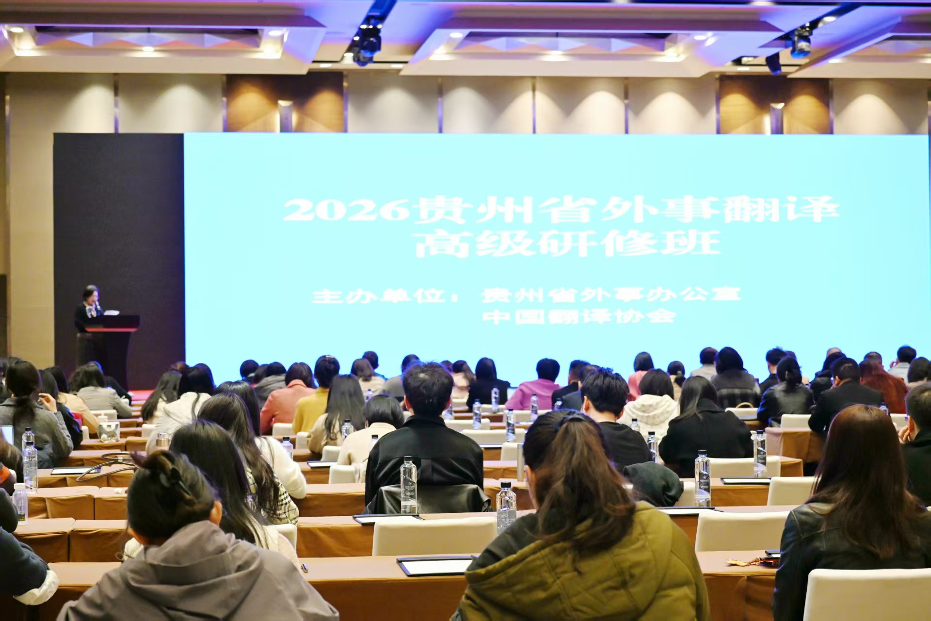 近日,中国翻译协会联合贵州省外事办公室在贵阳举办2026贵州省外事翻译高级研修班。本次研修班邀请中国翻译协会常务副会长、中国外文局原副局长兼总编辑黄友义,中国外文局西欧与非洲传播中心(今日中国杂志社)首席定稿人孙雷两位资深翻译专家授课,并辅以口译技能实训课程。来自贵州省委外事工作委员会成员单位、市州、1+9国家级开放创新平台、高校等从事外事翻译与国际传播的专业技术人员约170人参加培训。